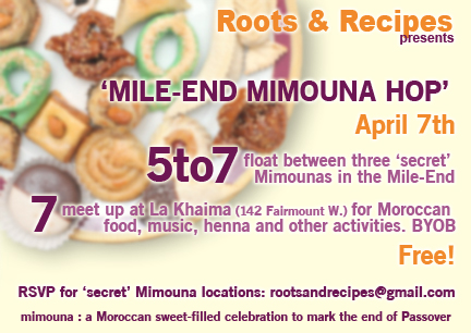 Lastly we are finalizing details for our Mimouna event next week. The first annual Mile-End Mimouna Hop will take place on Sunday, April 7th, between 5 and 7 our gracious volunteers will open up their homes and serve up delicious traditional Moroccan sweets. Then at 7, everyone is invited to meet up at La Khaima for Moroccan food, music, henna and other activities. The event is free and BYOB. Please RSVP to get the ‘secret’ locations and a map: rootsandrecipes {at} gmail {dot} com