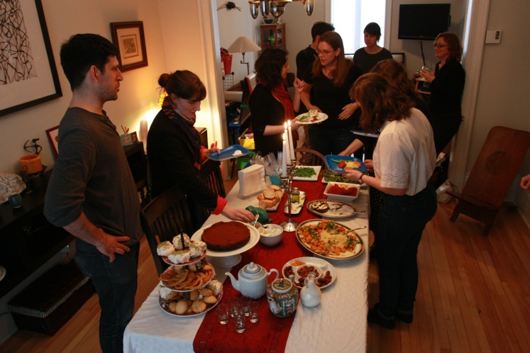 At 5:00 PM on Sunday, April 7th, 2013, there were three slightly hesitant doorbell rings in Montreal’s Plateau/Mile-End areas. Participants of Montreal’s first ‘Mile-End Mimouna Hop’ had been given the secret locations last minute and were separated into three groups to determine their starting point. Before the guests arrived, the three Mimouna hosts and their kitchen helpers had worked tirelessly to create their take on the Mimouna table, a spread of Moroccan sweets and dishes that are traditionally made to celebrate the end of Passover.